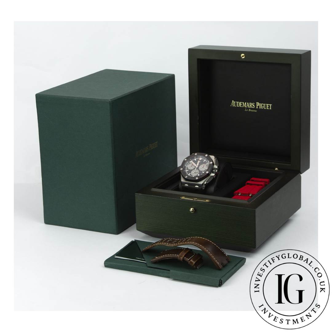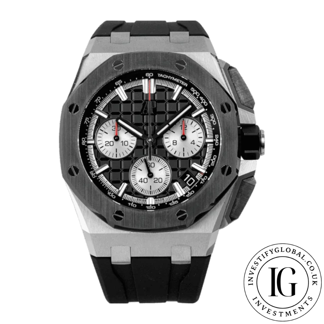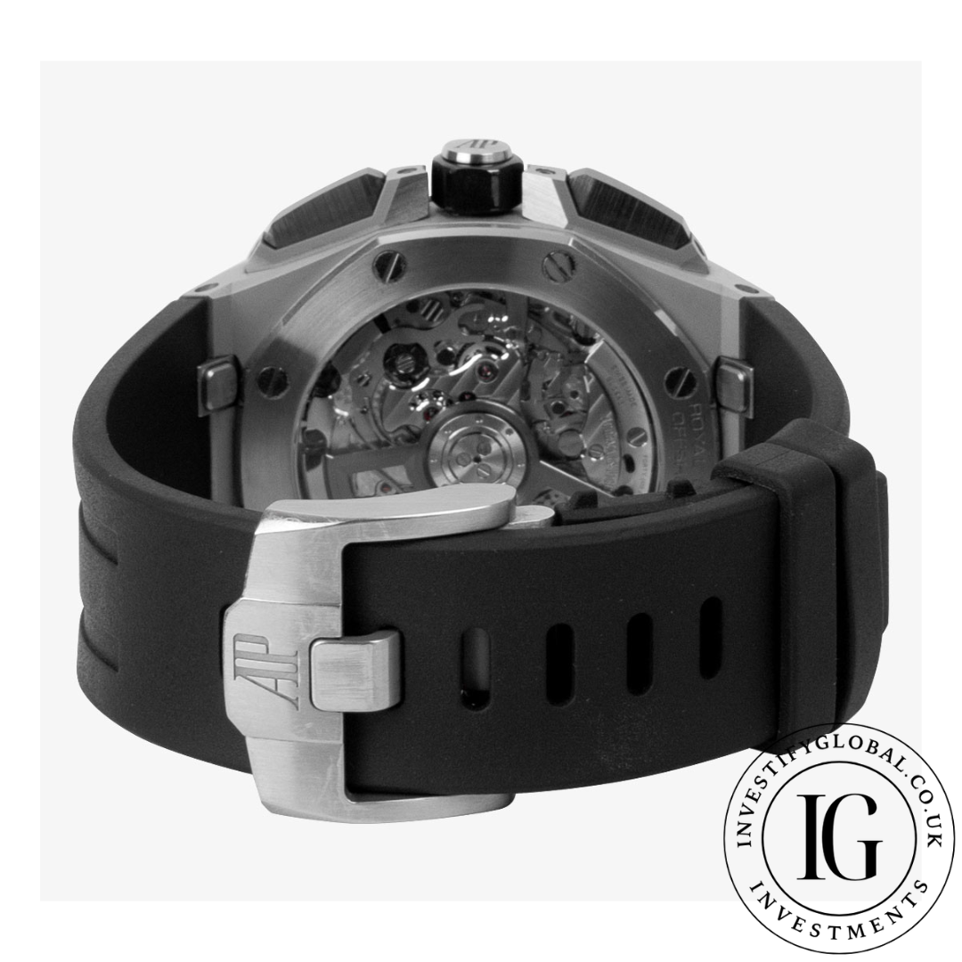 43mm Stainless Steel Case With a Fixed Black Ceramic Bezel Featuring a Black "Méga Tapisserie" Dial Rhodium-Toned Markers, White Gold Applied Hour-Markers & Royal Oak Hands With Luminescent Coating With Date Display Between 4 & 5 o'clock Position Featuring Sub-Dials Displaying 60 Second, 30 Minute & 12 Hour Markers. Black Rubber Strap Featuring a Stainless Steel Pin Buckle.