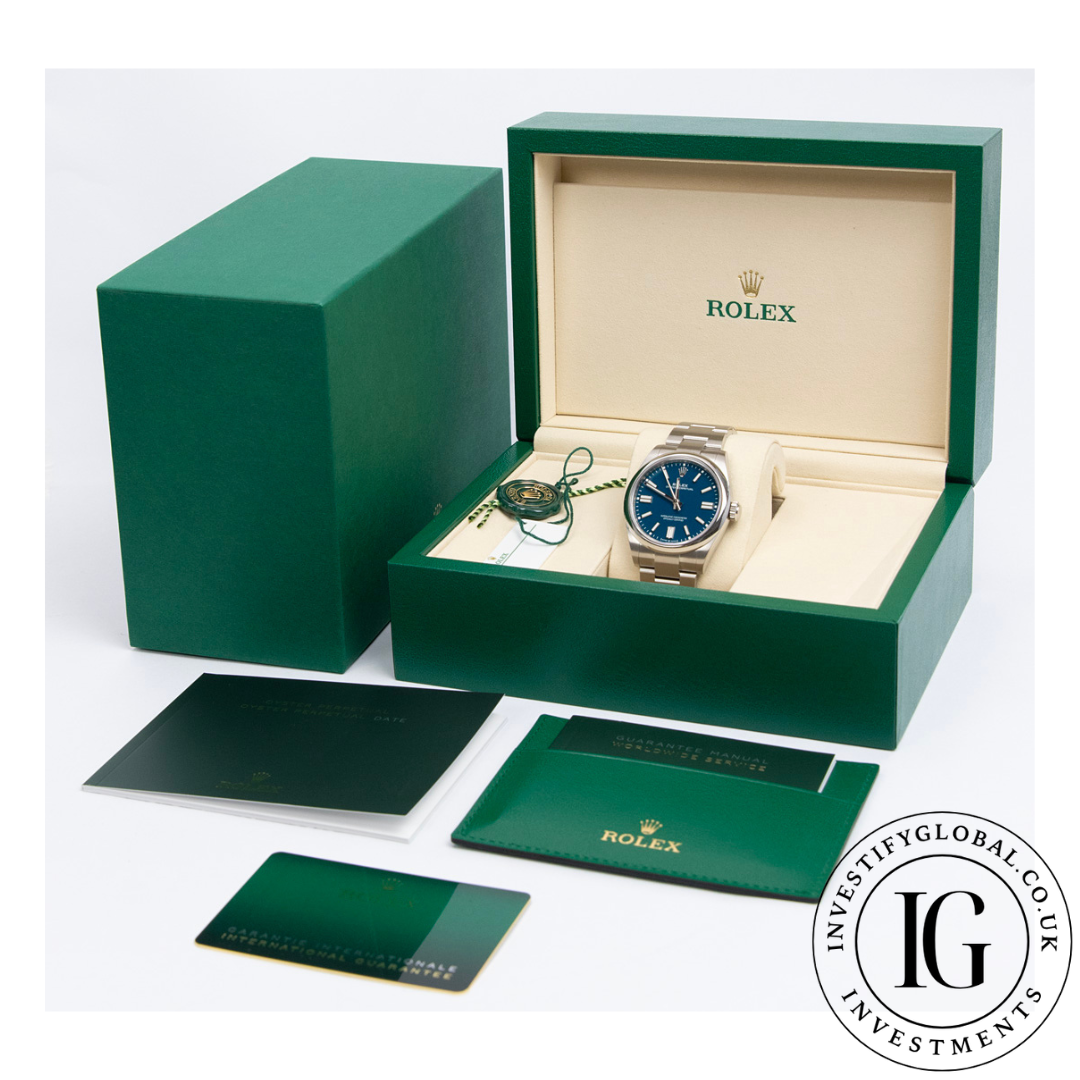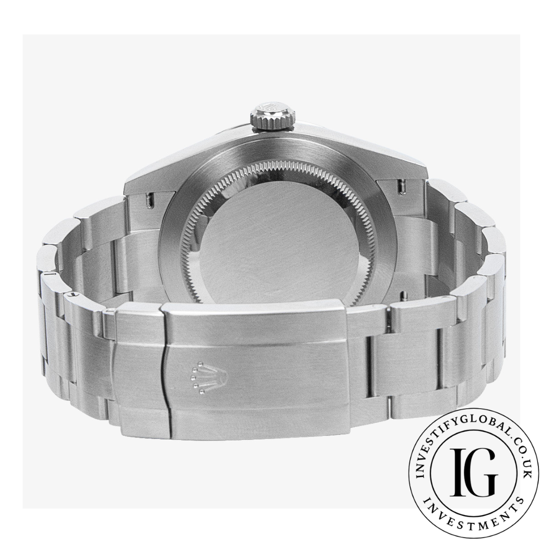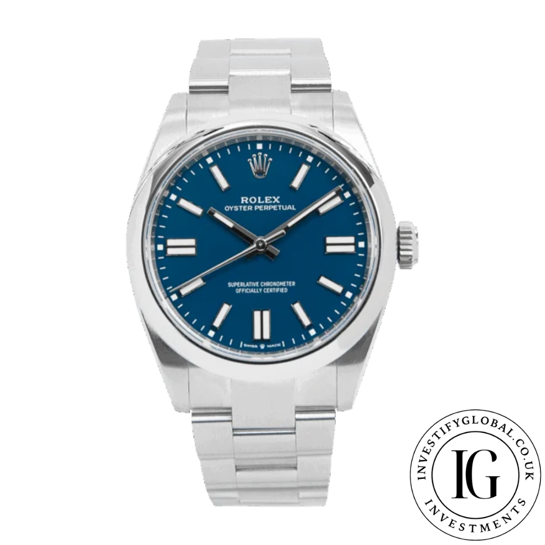 41mm Stainless Steel Case, Fixed Smooth Stainless Steel Bezel, Med Blue Dial, Automatic Movement, On A Stainless Steel Oyster Bracelet.